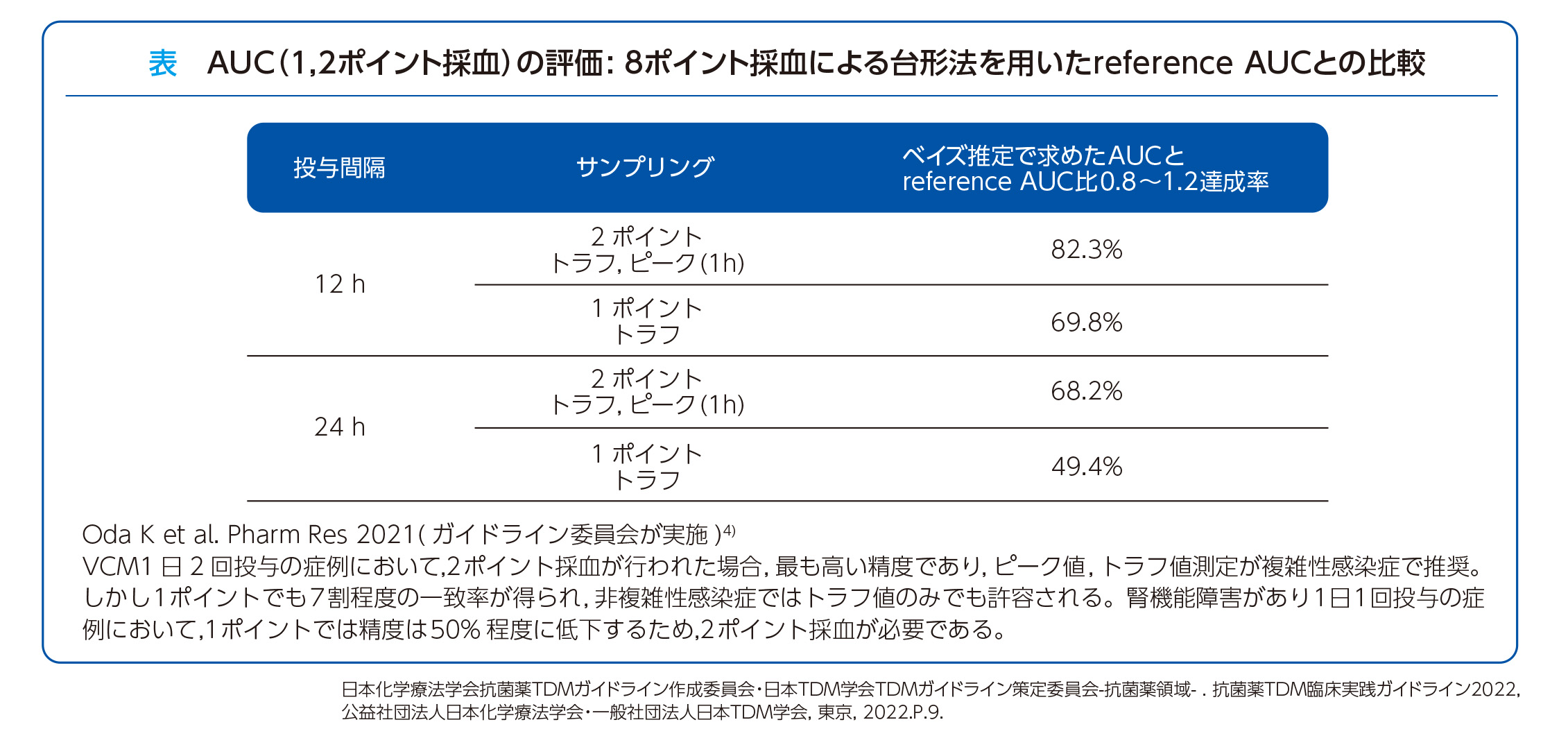 「抗菌薬TDM臨床実践ガイドライン2022」では、VCMのTDMにおいて、従来のトラフ値評価から血中濃度-時間曲線下面積(AUC:Area Under the blood concentration-time Curve)評価への移行が提唱されました。この変更に伴い、より正確なAUC算出のため、ピーク値とトラフ値の2点採血が推奨されています(表)1)。AUCを用いた評価では、ピーク値の測定により分布容積、ピーク値とトラフ値の差から排泄速度定数を把握できるため、より詳細な薬物動態の評価が可能となるからです。