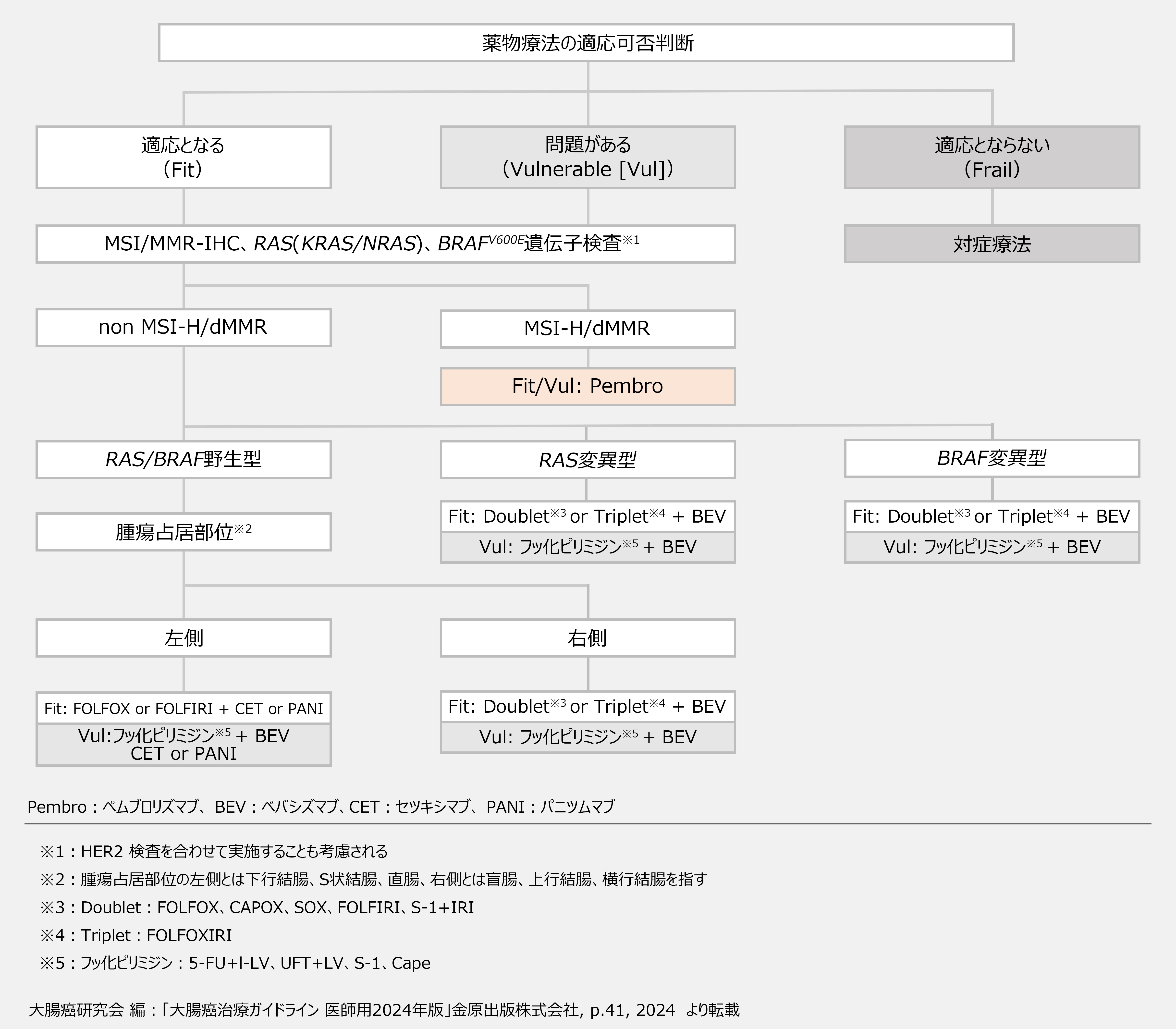 薬物療法が適応可能なFitまたはVulのうち、MSI-H/dMMR例では、ペムブロリズマブが選択されます。non MSI-H/dMMR例では、RAS、BRAF遺伝子変異の有無、腫瘍占居部位、 Fit・Vulのどちらであるかにより推奨されるレジメンが異なります。