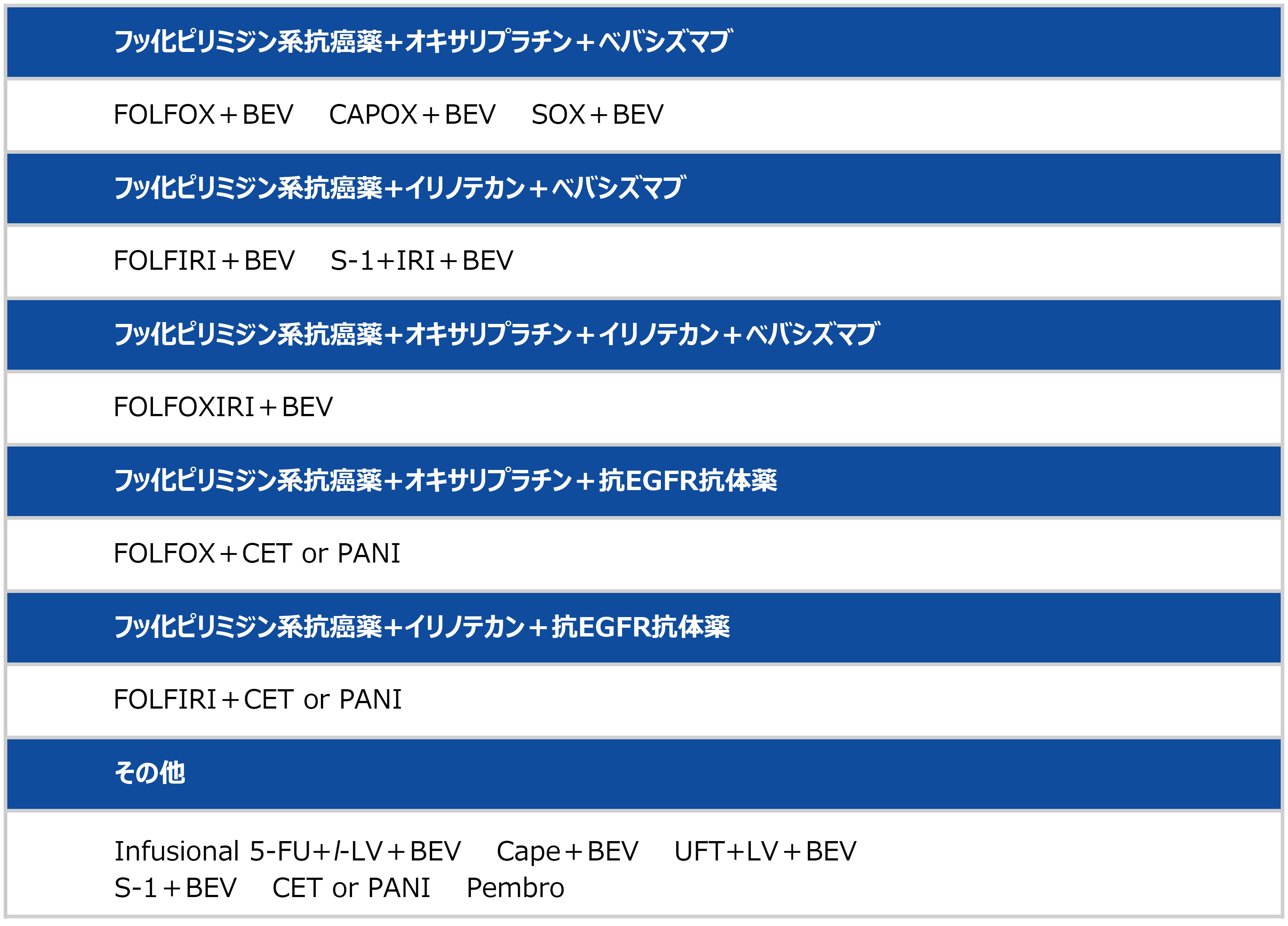 - FOLFOXIRI:フルオロウラシル+レボホリナート+オキサリプラチン+イリノテカン