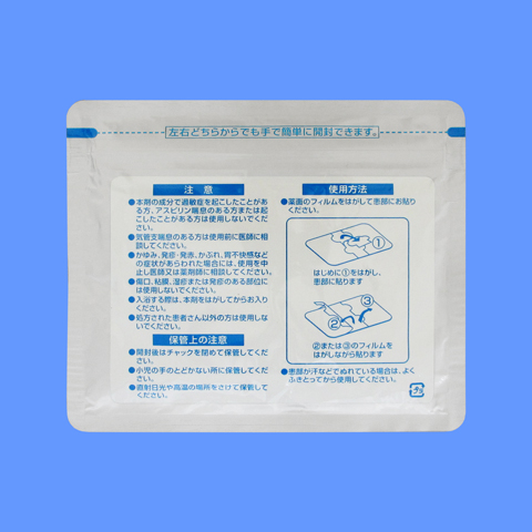 | 剤形・色調 | 淡黄色~淡褐色半透明の特異な芳香のある膏体を支持体に展延し、膏体表面をライナーで被覆した貼付剤 | 大きさ(cm) | 7×10 | ||
