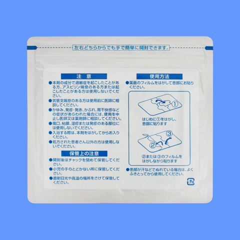 | 剤形・色調 | 淡黄色~淡褐色半透明の特異な芳香のある膏体を支持体に展延し、膏体表面をライナーで被覆した貼付剤 | 大きさ(cm) | 10×14 | ||