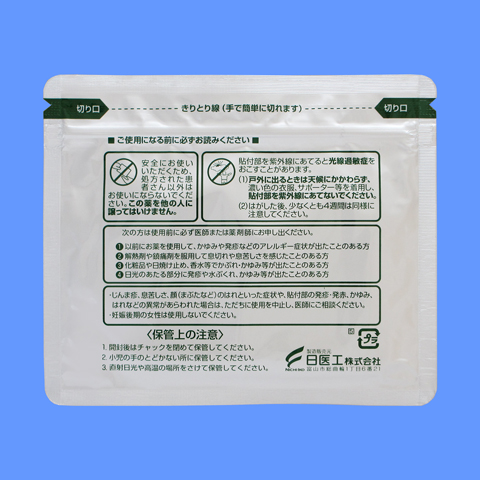 | 剤形・色調 | 膏体を支持体に展延し、膏体面をライナーで被覆した貼付剤である。膏体面を観察するとき、淡褐色で ある。 | 大きさ(cm) | 7×10 | ||