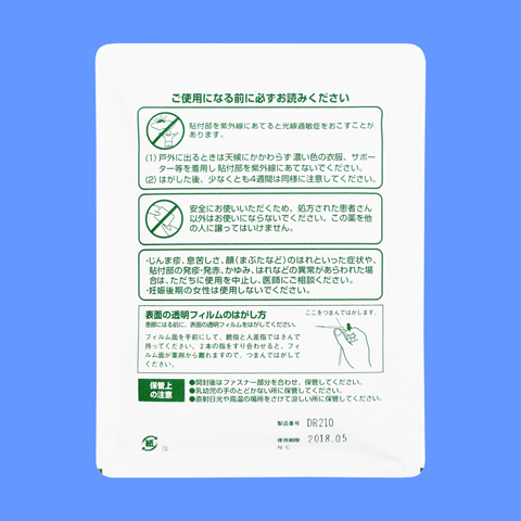 | 剤形・色調 | 白色の膏体を支持体に展延し、膏体表面をライ ナーで被覆したパップ剤で、芳香を有する。 | 大きさ(cm) | 10×14 | ||