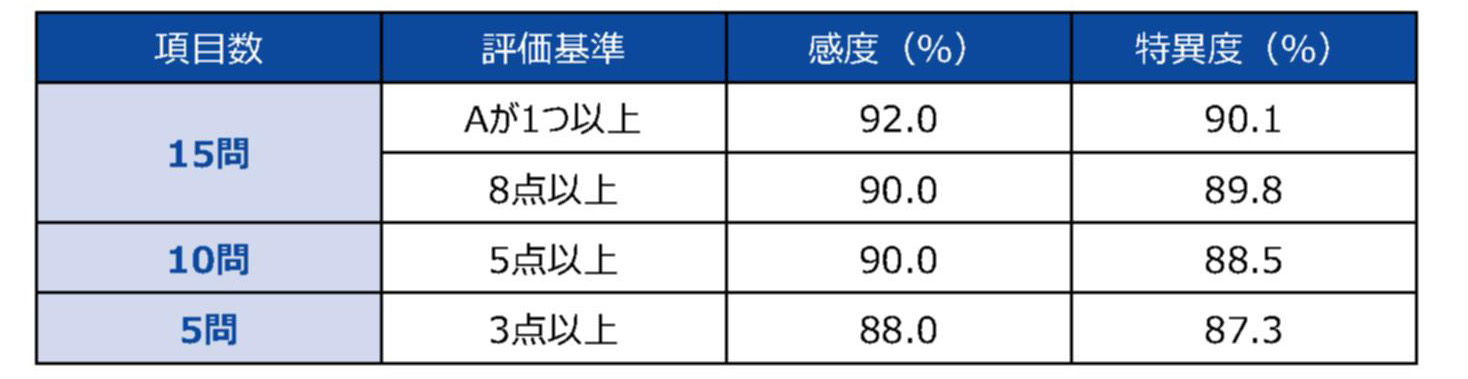 その後、15項目から他者による評価が可能な10問を選択したSwallow-103)、さらに5項目に絞り、簡易的にスクリーニングが可能なSwallow-52)が開発されました。また、評価法として「A:4点」「B:1点」「C:0点」とし、その合計点で評価するスコア評価方式が開発されました4)。それぞれの質問紙の評価基準および、感度、特異度は以下の通りです。いずれも、本人以外のご家族や介護者等の観察による評価が可能です。