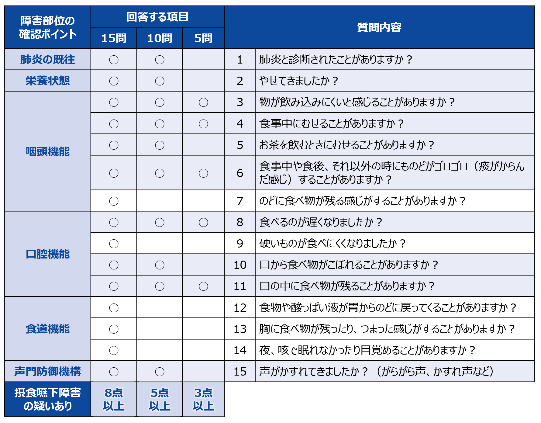 聖隷式嚥下質問紙1)(摂食嚥下障害 質問紙)は、15項目を各3段階で評価することで、摂食嚥下障害を効率よくかつ簡便にスクリーニングできる質問紙で、肺炎の既往、栄養状態、口腔・咽頭・食道機能、声門防御機構などが反映される構造になっています(感度92.0%、特異度90.1%)。